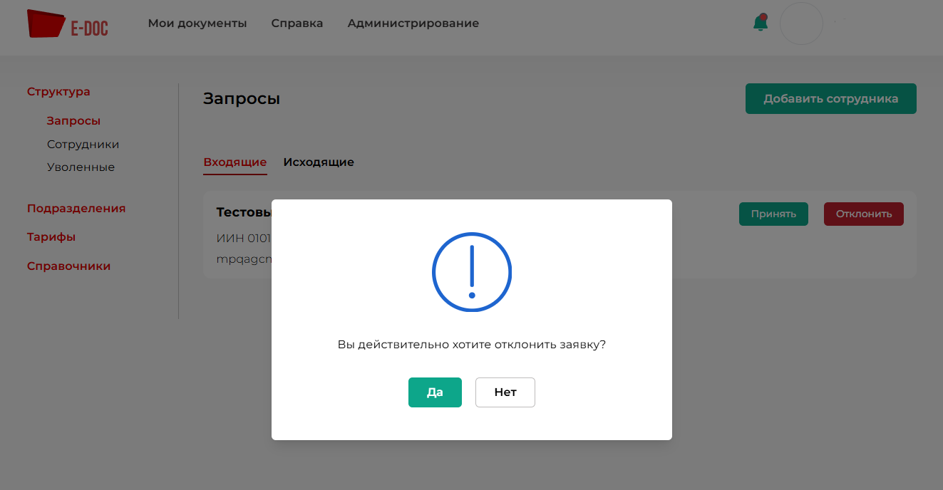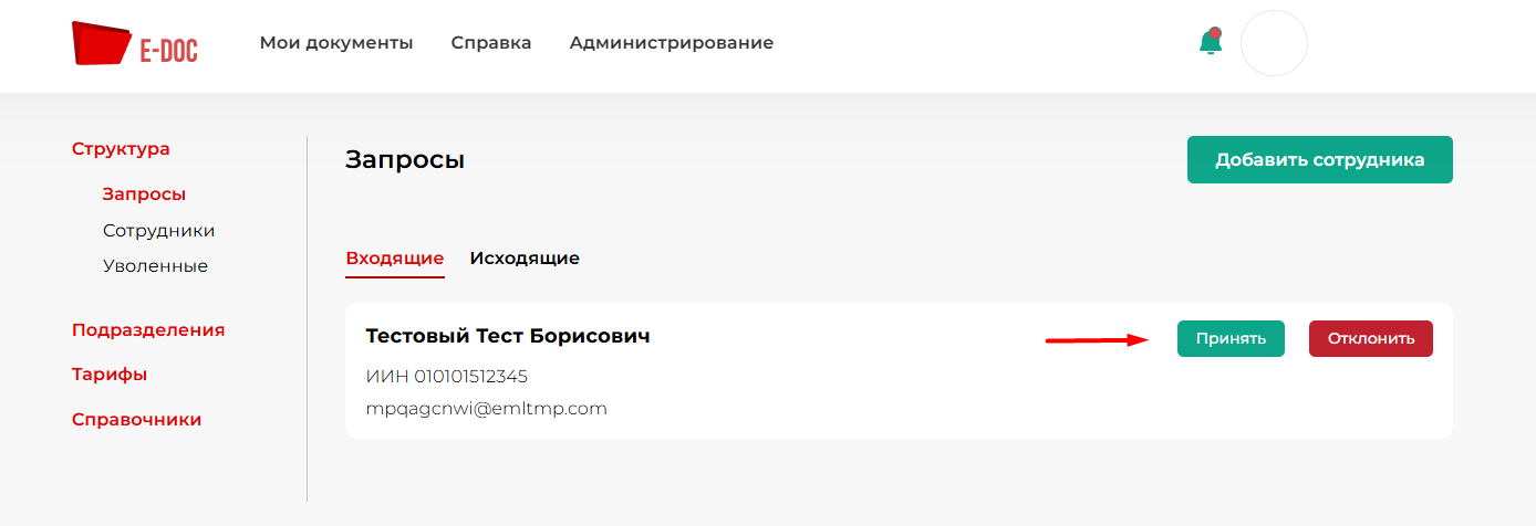 В данном разделе будут отображаться запросы пользователей на вступление в компанию (см. рисунок 1). Во вкладке Входящие отображаются запросы на вступления компании от сотрудников при их регистрации. Администратор компании принимает либо отклоняет пользователя.