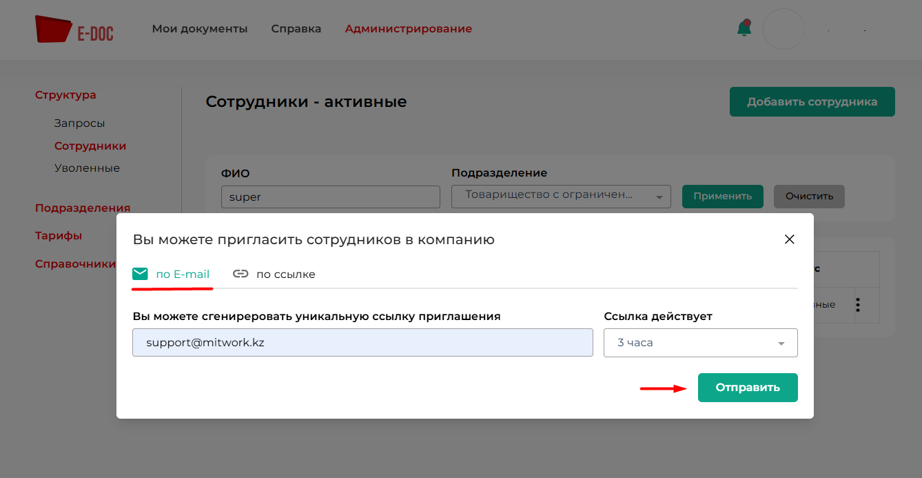 В открывшийся окне появляется возможность пригласить сотрудников в компанию указав электронную почту. Также необходимо указать срок действия ссылки, далее «Отправить» ( см. рисунок 5).