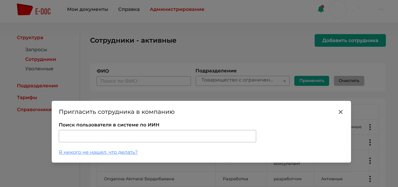 Если пользователь зарегистрирован в системе, но не привязан к вашей компании, необходимо его добавить в компанию. Для этого, нажмите кнопку «Добавить сотрудника». Система открывает модальное окно, где можно поискать пользователя по ИИН либо электронному адресу (см. рисунок 1).
