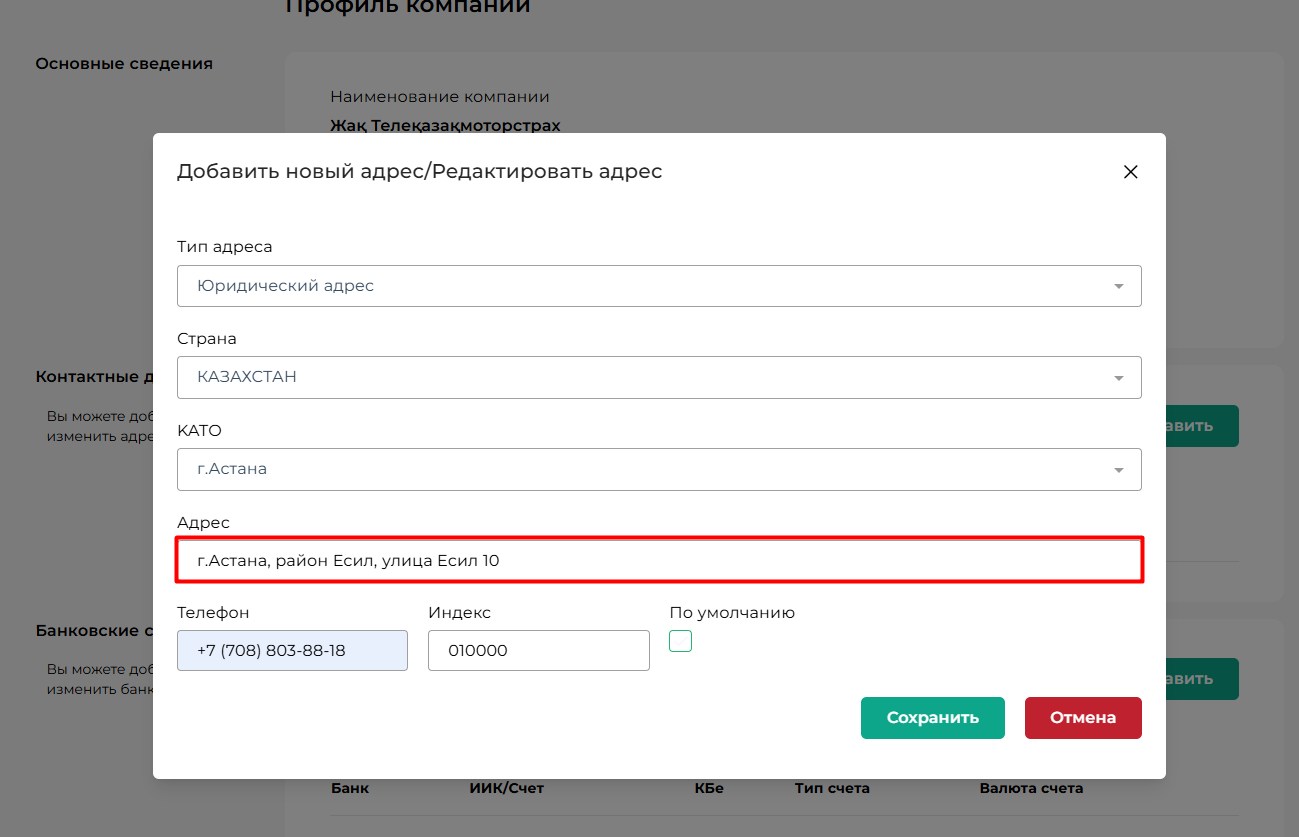 Для добавления адреса необходимо нажать на кнопку Добавить. Система отображает модальное окно, где нужно выбирать тип адреса, страну, като из выпадающего списка. В выделенном поле, вы можете прописать полный адрес (см. рисунок 7). Для редактирования адреса, нажмите на иконку карандаш.