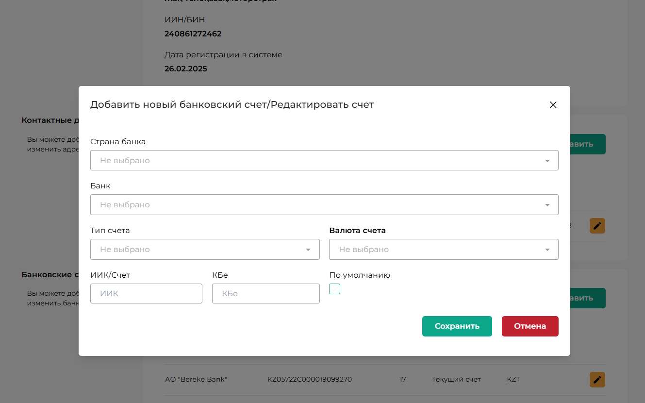 Для добавления банковского счета, необходимо нажать на кнопку Добавить. Система отображает модальное окно, где выбирается страна банка, банк (резидент), тип счета, валюта счета из выпадающего списка. Также необходимо заполнить ИИК/Счет и Кбе. Вы можете проставить галочку По умолчанию к тому счету, который используется везде (см. рисунок 9).