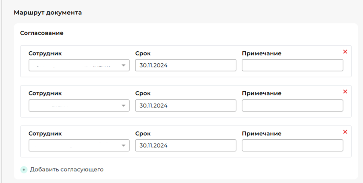 Чтобы добавить согласующего, нажмите кнопку «Добавить» согласующего. Укажите срок исполнения задачи и, при необходимости, добавьте примечание. Затем выберите сотрудника, который будет подписывать документ, и также укажите срок исполнения (см. рисунок 4).