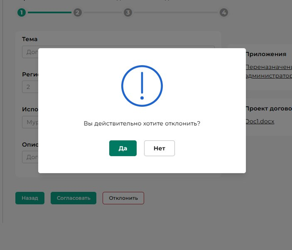 Для того что бы отклонить документ нужно нажать «ДА». После необходимо указать причину отклонения.