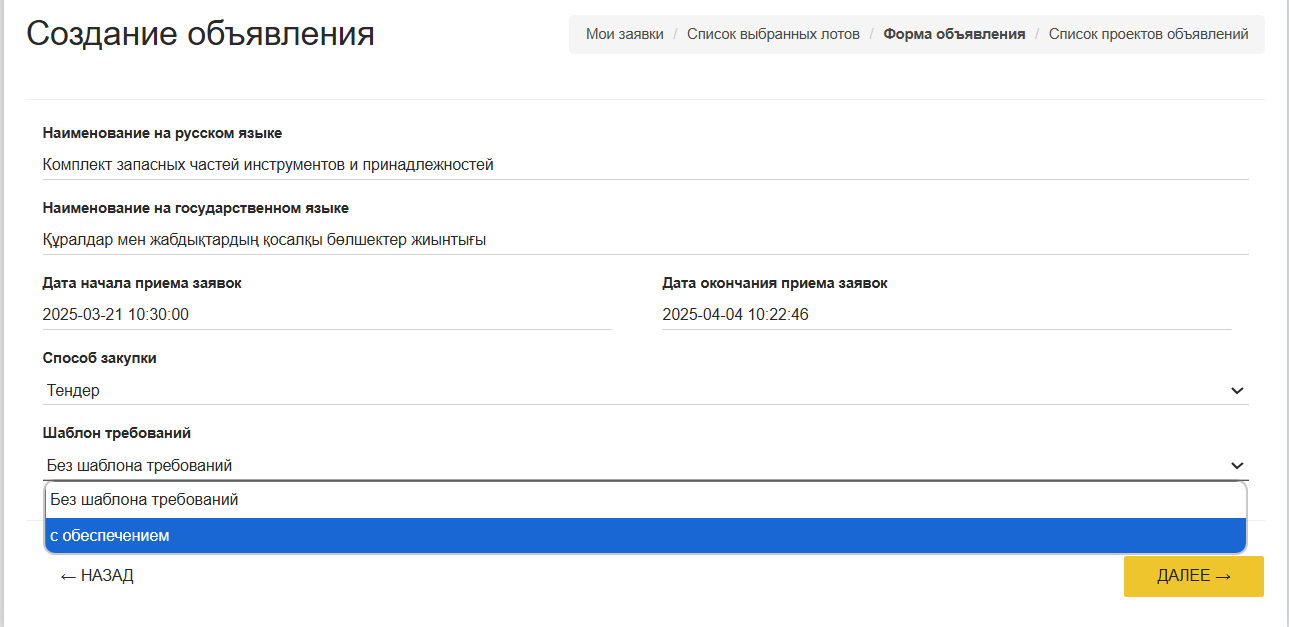 Также в данном разделе при выборе шаблона "с обеспечением" должна отражаться информация об обеспечении заявки.