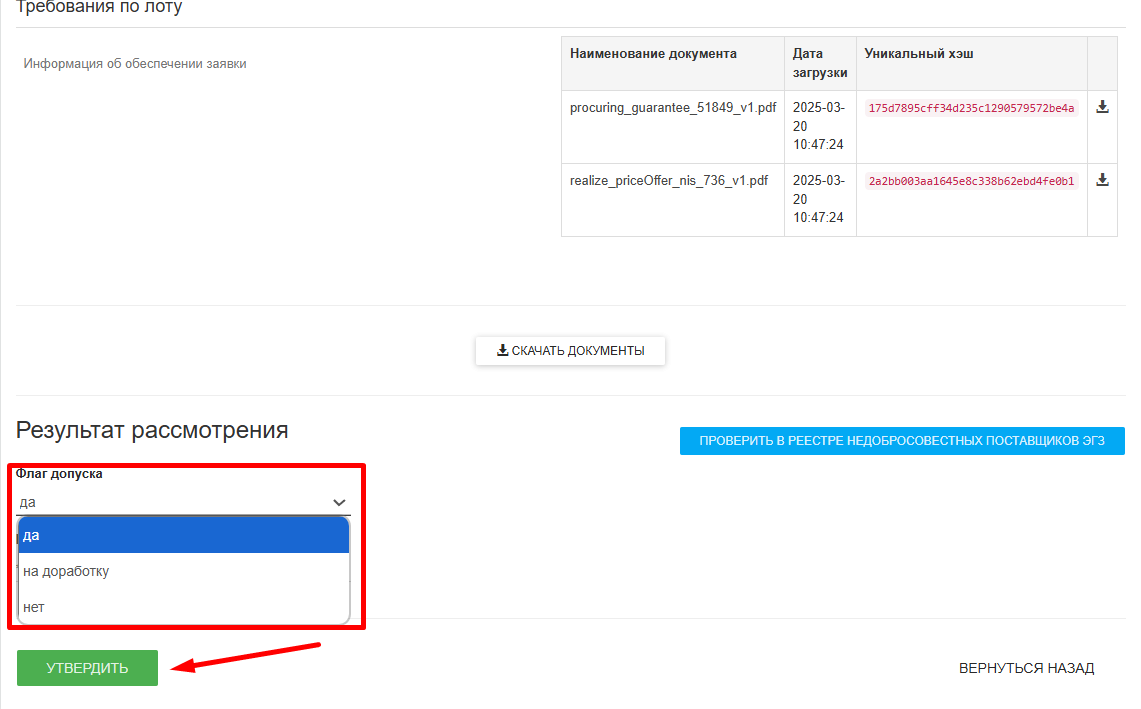 Секретарю необходимо ознакомиться с предоставленной информацией поставщика и в поле "Флаг допуска" выбрать решение.
