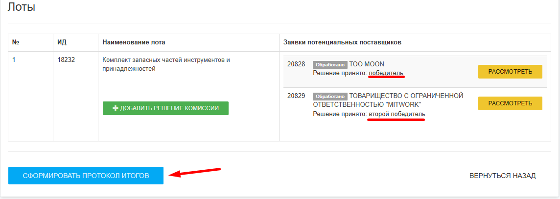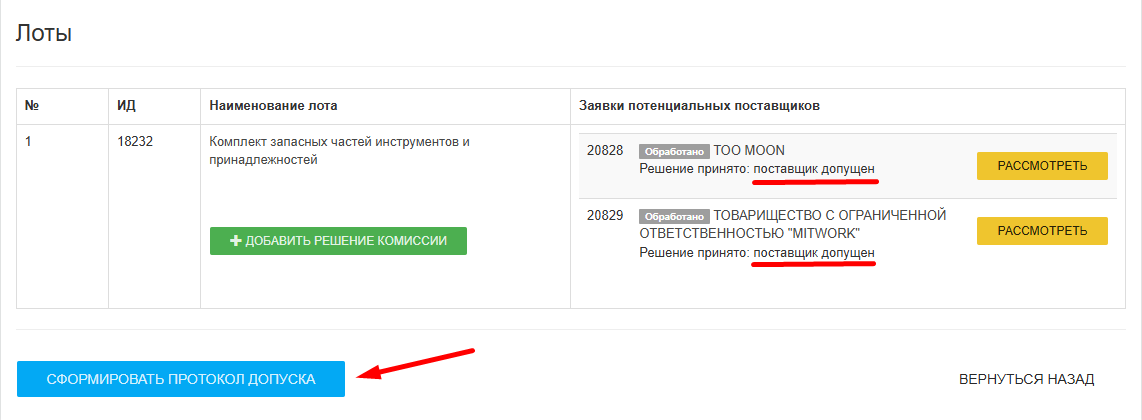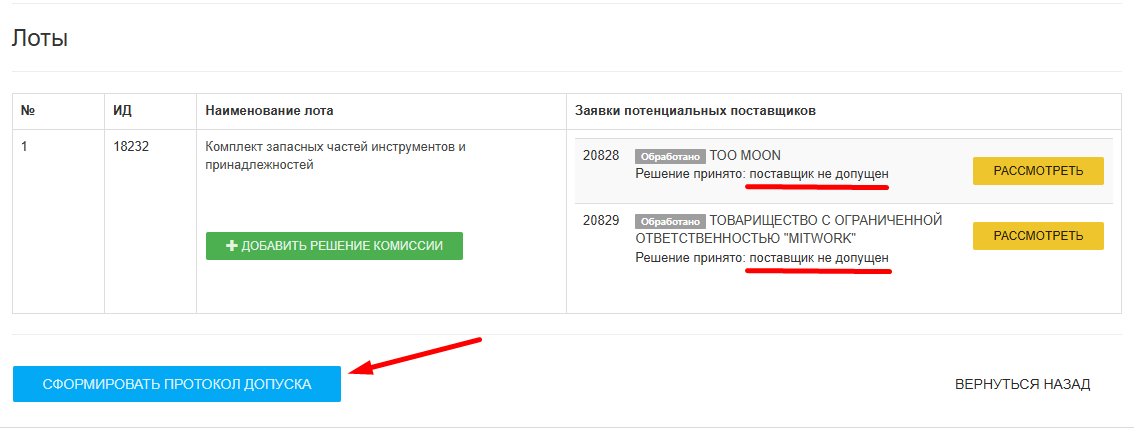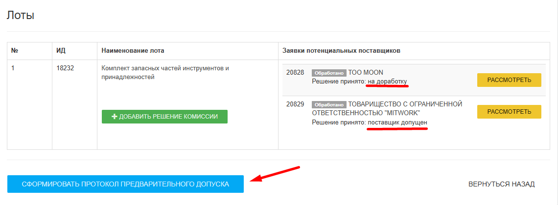После утверждения решения по каждому потенциальному поставщику, нажмите на "Сформировать протокол предварительного допуска".