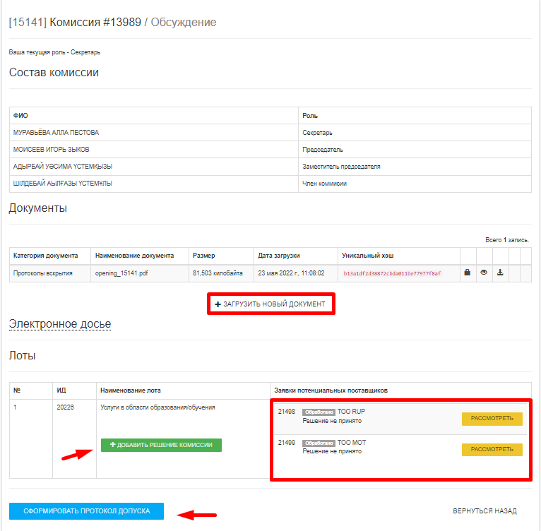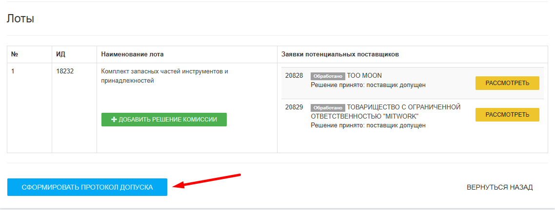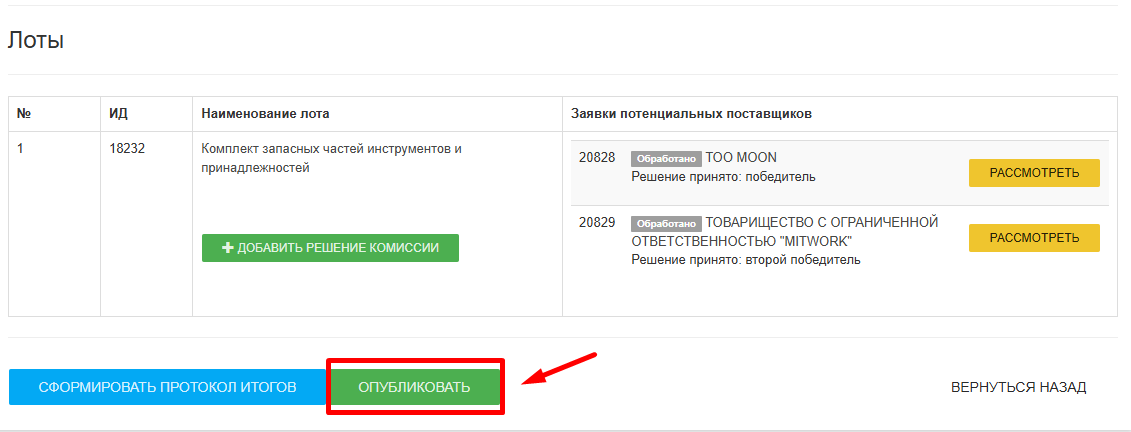 После утверждения решения по каждому потенциальному поставщику, нажмите на "Сформировать протокол допуска", далее, нажмите на "Опубликовать".
