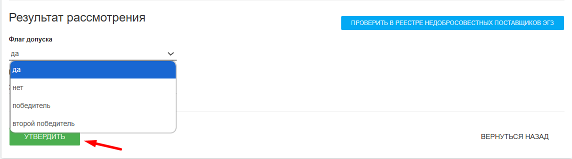 После публикации протокола допуска необходимо определить флаг допускапобедитель/второй победитель нажав на кнопку "Рассмотреть"-"Утвердить".