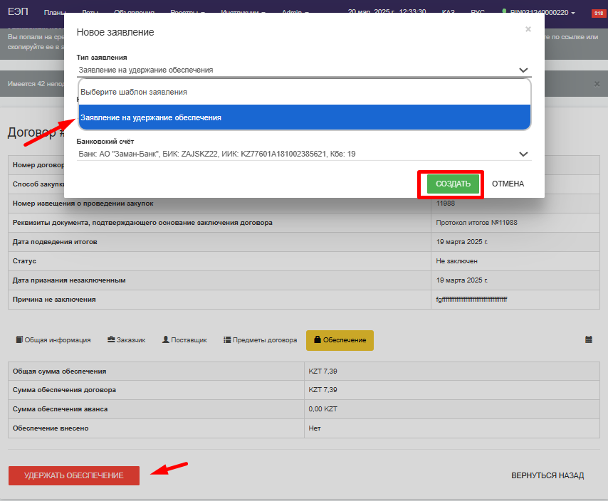Удержание обеспечения заявки доступно в статусах "Не заключен" и "Расторгнут". Для этого нужно нажать кнопку "Удержать обеспечение". Затем в открывшейся форме заявления выбрать тип "Заявление на удержание обеспечения".