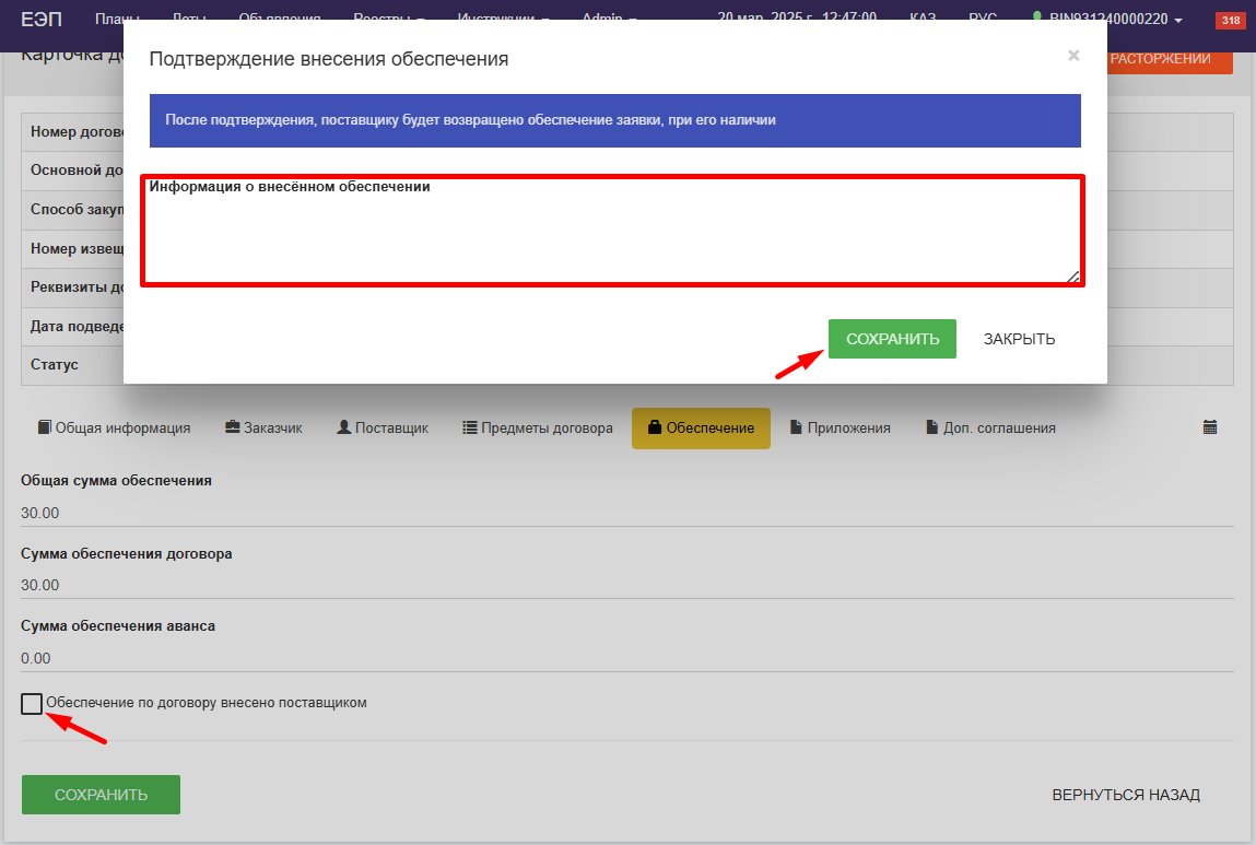 Возврат обеспечения заявки доступен, если статус договора — "Утвержден". Для этого в разделе "Обеспечение" нужно поставить галочку в чекбоксе, указав информацию о внесенном обеспечении, и затем нажать "Сохранить".