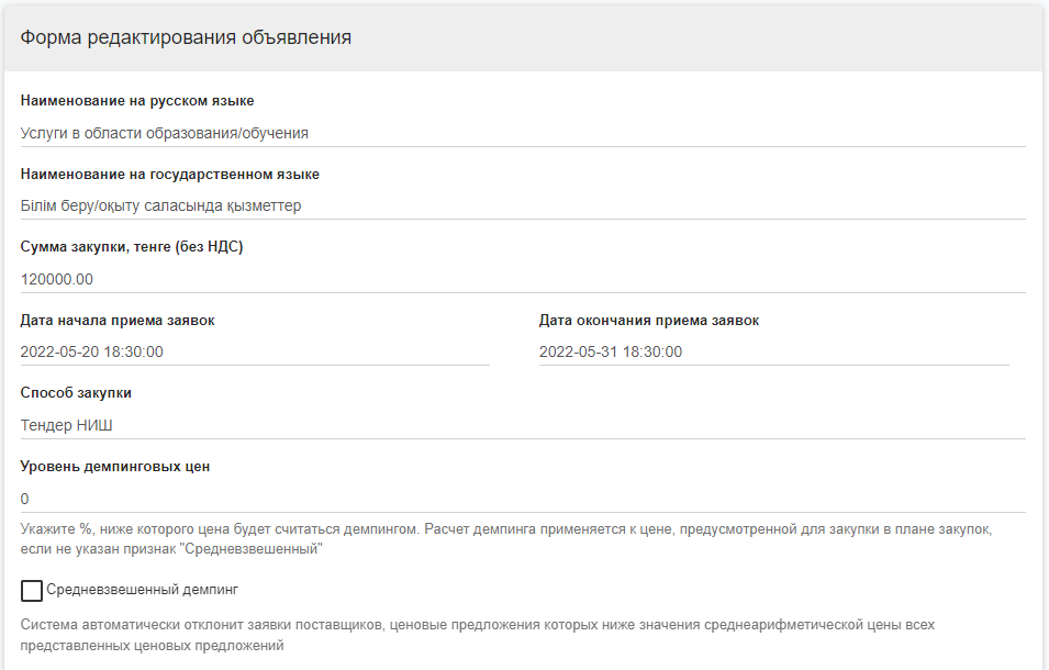 Уровень демпинговых цен - значение уровня демпинговых цен указывается для тех ТРУ, при закупках которых демпинговые цены могут быть рассчитаны от суммы, предусмотренной для закупки в плане закупок без учета НДС.