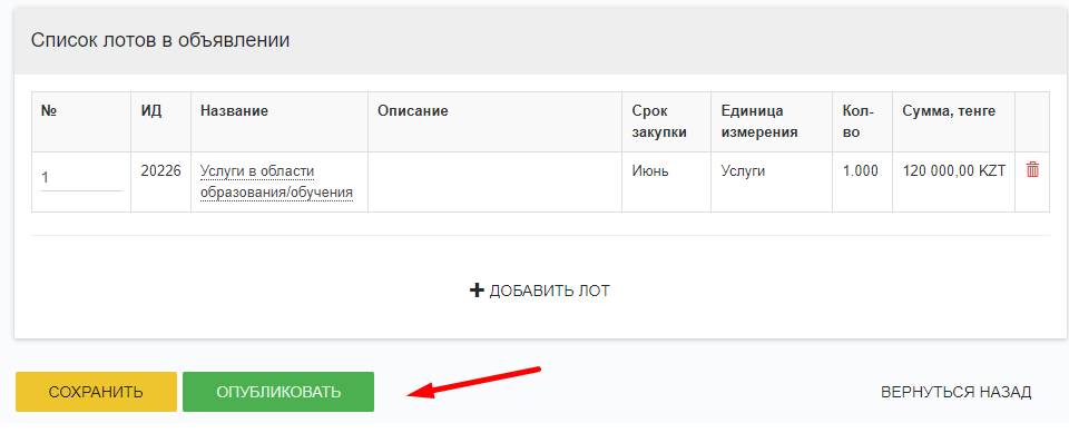 При необходимости можете добавить еще дополнительно лоты, нажав на "Добавить лот".