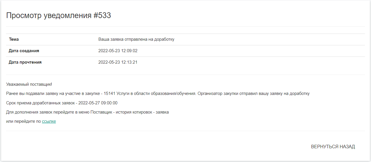 После публикации протокола предварительного допуска Поставщикам приходит уведомление.
