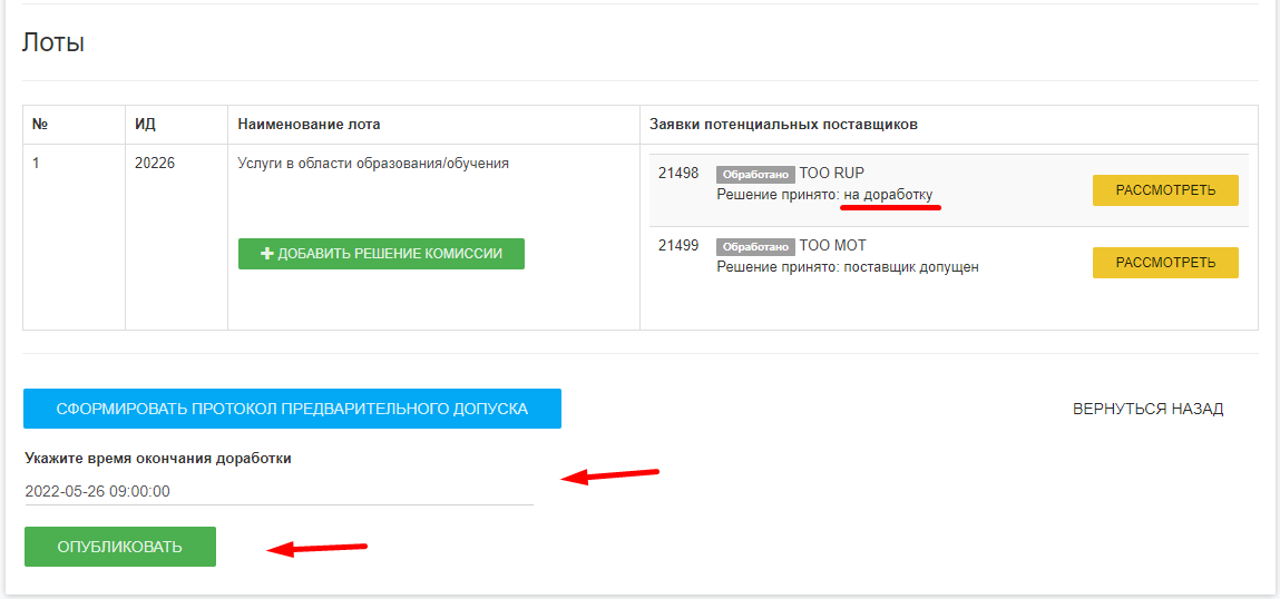 В разделе "Лоты" будут отображены все заявки потенциальных поставщиков.  Для повторного рассмотрения заявок, предоставленных поставщиками, которых отправили на доработку, необходимо нажать на кнопку "Рассмотреть".